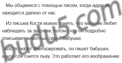Вспомни, когда мы общаемся с помощью писем. Можно ли из письма понять, любит ли Костя наблюдать за зверями? Любит ли он фантазировать? Докажи своё мнение.