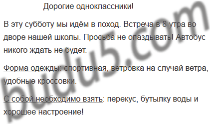 Летом часто ходят в походы. Представь, что ты приглашаешь друзей в поход. Составь объявление. Не забудь, что в объявлении необходимо указать, куда вы отправляетесь, где встречаетесь, что с собой нужно взять.