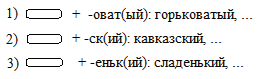 1. Заполните пропуски двумя примерами. Значение суффикса определите по словарику значения морфем. Выполнив эту работу, расскажите о суффиксальном способе образования имён прилагательных.