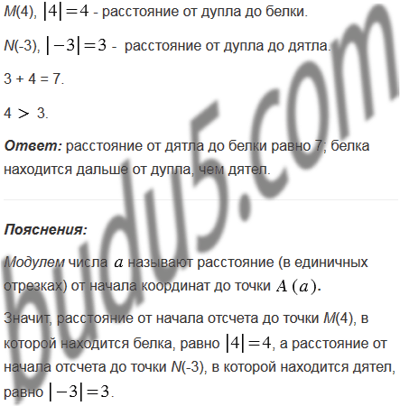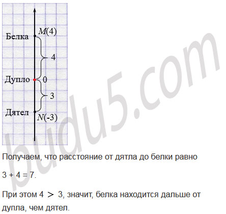 Белка сидит на дереве в точке М(4), а дятел - в точке N(-3). Какое расстояние от дятла до белки? Кто из них дальше от дупла, если дупло принято за начало отсчета?