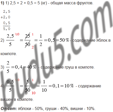 1) Для приготовления компота смешали 2,5 кг яблок, 2 кг груш и 0,5 кг вишен. Найдите процентное содержание каждого вида фруктов, взятых для приготовления компота.