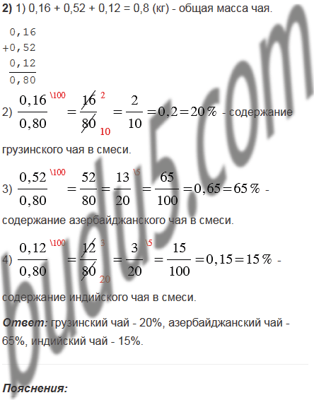 2) Смешали 0,16 кг грузинского, 0,52 кг азербайджанского и 0,12 кг индийского чая. Найдите процентное содержание каждого вида чая в полученной смеси.