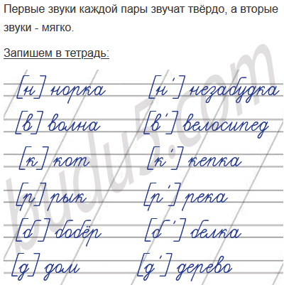 Как произносятся первые звуки каждой пары? А вторые? Придумай и запиши в тетрадь слова, в которых есть эти звуки. Пиши, диктуя себе по слогам. Записывай так.