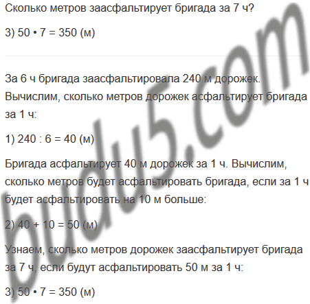 2. За 6 ч работы бригада заасфальтировала 240 м дорожек в парке, выполняя один и тот же объём работы за каждый час. Сколько метров таких дорожек бригада заасфальтирует за 7 ч, если за 1 ч будет асфальтировать дорожек на 10 м больше?