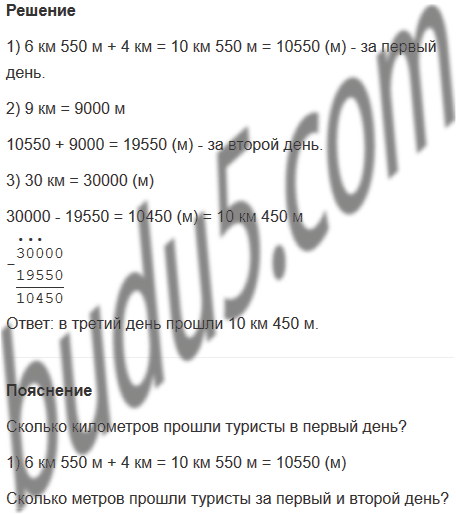 2. Маршрут длиной 30 км туристы прошли за 3 дня. В первый день до привала они прошли 6 км 550 м, а после привала - ещё 4 км. Во второй день туристы прошли всего 9 км. Сколько километров туристы прошли в третий день?