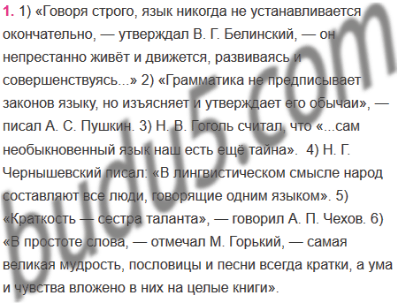 1) Говоря строго, язык никогда не устанавливается окончательно: он непрестанно живёт и движется, развиваясь и совершенствуясь... (В. Белинский) 2) Грамматика не предписывает законов языку, но изъясняет и утверждает его обычаи. (А. Пушкин) 3) ...сам необыкновенный язык наш есть ещё тайна. (Н. Гоголь) 4) В лингвистическом смысле народ составляют все люди, говорящие одним языком. (Н. Чернышевский) 5) Краткость — сестра таланта. (А. Чехов) 6) В простоте слова — самая великая мудрость, пословицы и песни всегда кратки, а ума и чувства вложено в них на целые книги. (М. Горький)