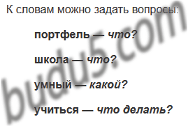 Какие вопросы можно задать к словам портфель, школа, умный, учиться?