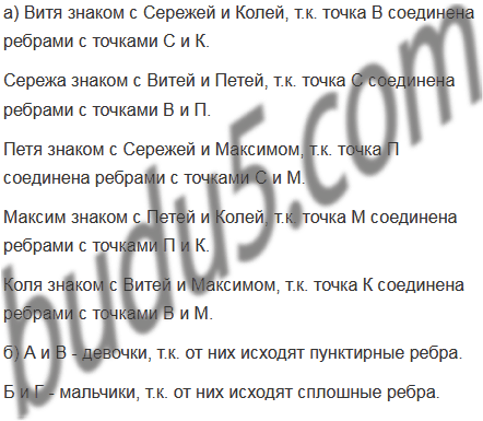 б) Во дворе гуляют братья и сестры одной семьи. Кто из этих детей мальчики, а кто девочки (рис. 91, б)? (Пунктирные ребра графа исходят от сестер, а сплошные от братьев.)