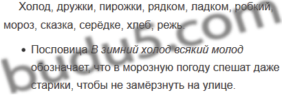 1) В зимний холод всякий молод. 2) Каковы дружки, таковы и пирожки. 3) Сядем рядком да поговорим ладком. 4) Смелый там найдёт, где робкий потеряет. 5) Спасибо, мороз, что снега нанёс. 6) Сказка с начала начинается, до конца читается, а в серёдке не перебивается. 7) Хлеб-соль ешь, а правду режь.