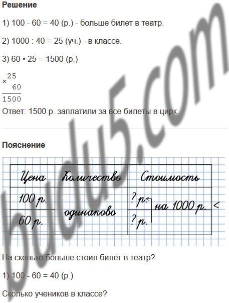 1. Для всех учеников одного класса купили билеты в театр и в цирк. Каждый билет в театр стоил 100 р., а в цирк - 60 р. Сколько рублей заплатили за все билеты в цирк, если за них заплатили на 1000 р. меньше, чем за все билеты в театр?