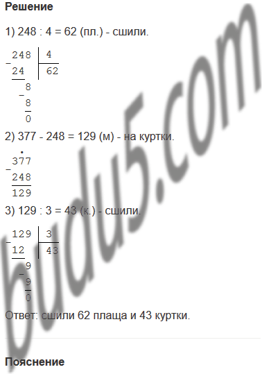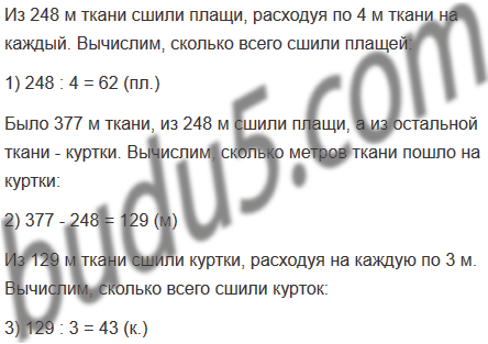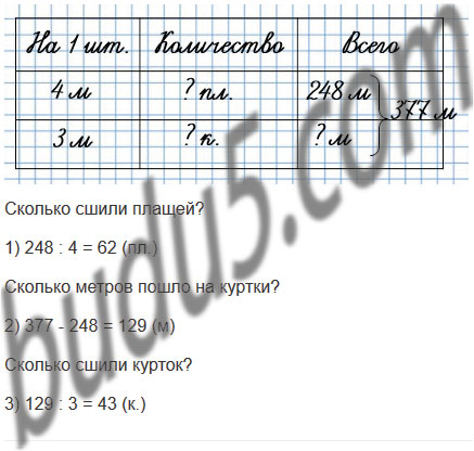 2. В ателье было 377 м ткани. Из 248 м ткани сшили плащи, расходуя по 4 м ткани на каждый, а из остальной ткани - куртки, расходуя по 3 м на каждую. Сколько всего сшили плащей и курток?