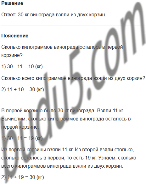 3. В двух корзинах было по 30 кг винограда. Из первой корзины взяли 11 кг винограда, а из второй взяли столько килограммов, сколько осталось в первой. Сколько всего килограммов винограда взяли из двух корзин? Запиши только ответ.