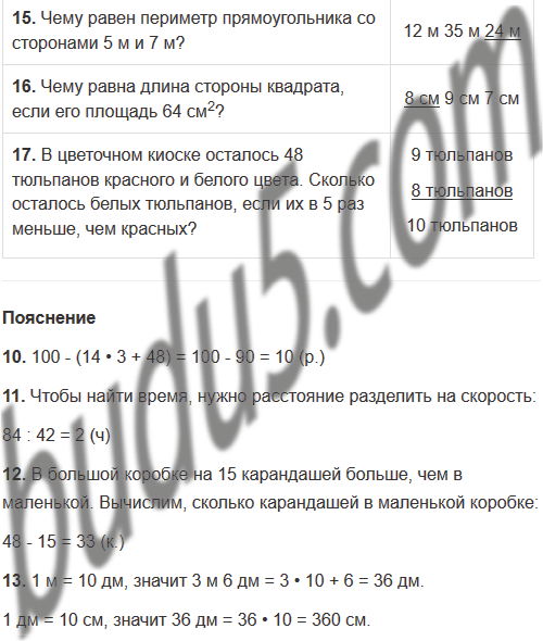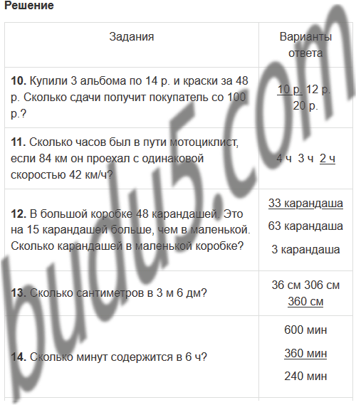 | 10. Купили 3 альбома по 14 р. и краски за 48 р. Сколько сдачи получит покупатель со 100 р.? | 10 р. 12 р. 20 р. |