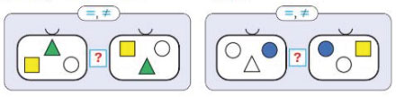 Между двумя группами слева надо поставить знак не равно (не совпадают белый квадрат-красный квадрат, а также белый треугольник-красный треугольник), а между двумя группами справа - равно (потому что они полностью состоят из одних и тех же предметов тех же цветов).