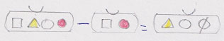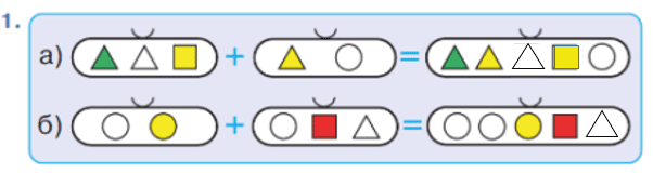 В левом варианте совпадают жёлтый квадрат, жёлтый круг и синий треугольник, а другие фигуры нет, это неравенства. В правом варианте совпадают все фигуры, это равенства.