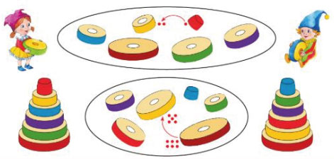 2. Детали какой пирамидки расположены выше, ниже? Назови цвет колечек в заданном порядке (увеличения или уменьшения).
