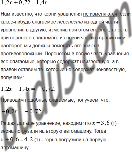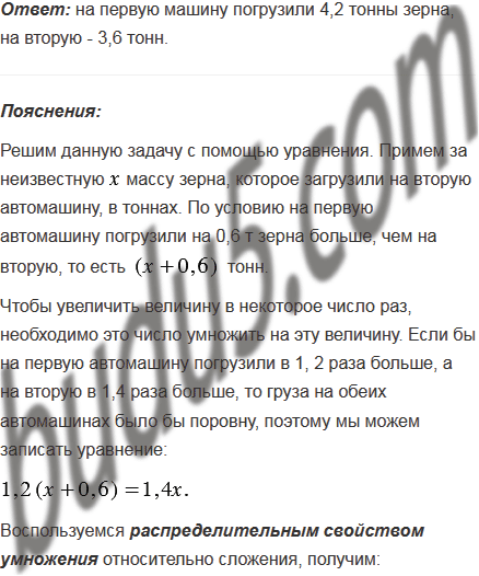 На первую автомашину погрузили на 0,6 т зерна больше, чем на вторую. Если бы на первую автомашину погрузили в 1, 2 раза больше, а на вторую в 1,4 раза больше, то груза на обеих автомашинах было бы поровну. Сколько тонн груза погрузили на каждую автомашину?