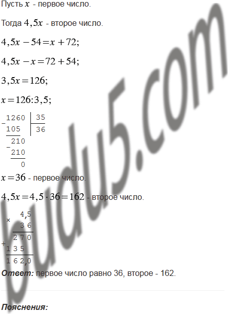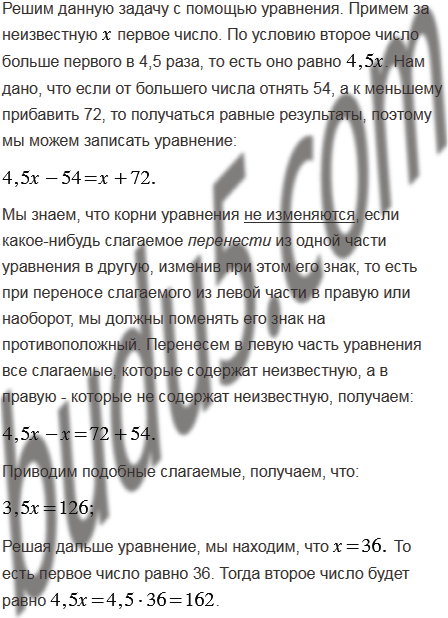 Одно число больше другого в 4,5 раза. Если от большего числа отнять 54, а к меньшему прибавить 72, то получаться равные результаты. Чему равны эти числа?
