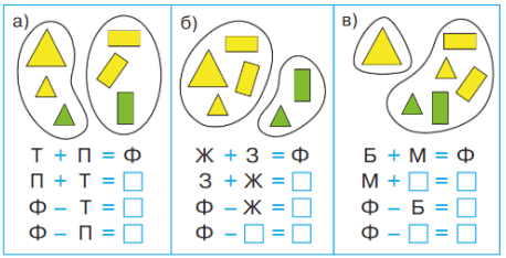 Т - треугольники, П - прямоугольники, Ф - фигуры, Ж - жёлтые, З - зелёные, Б - большие, М - маленькие.