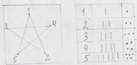 У звезды и пятиугольника 5 точек и 5 отрезков, но у пятиугольника стороны не пересекаются, а у звезды пересекаются.