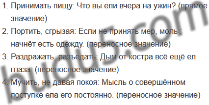 1) Принимать пищу 2) Портить, сгрызая 3) Раздражать, разъедать 4) Мучить, не давая покоя |