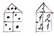 Нужно дополнить недостающими точками или числами строчку, чтобы в сумме получилось число, указанное на крыше дома.