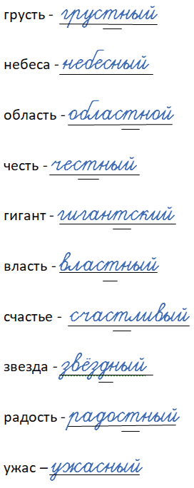 • Подберите к каждому слову и запишите однокоренное имя прилагательное.