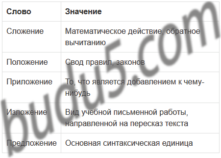 Слова для справок: сложение, положение. приложение, изложение, предложение.