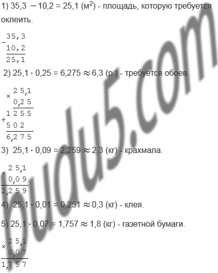 Для оклейки стен обоями на 1 м2 требуется: обоев 0,25 рулона, крахмала 0,09 кг, клея 0,01 кг, газетной бумаги 0,07 кг. Сколько материалов потребуется для оклейки обоями комнаты, если площадь всех её стен вместе с окнами и дверями - 35,3 м2, а площадь окон и дверей равна 10,2 м2? Ответ округлите с избытком до десятых долей килограммов и до целых рулонов.