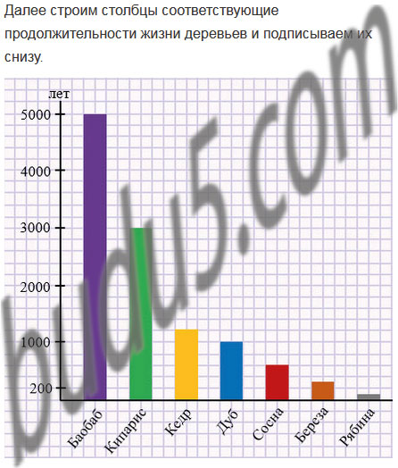 Постройте столбчатую диаграмму сравнительной продолжительности жизни некоторых деревьев по следующим данным: баобаб - 5000 лет, кипарис - 3000 лет, кедр - 1200 лет, дуб - 1000 лет, сосна обыкновенная - 600 лет, береза - 250 лет, рябина - 80 лет.