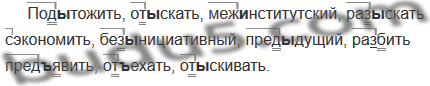 Под..тожить, от..скать, меж..нститутский, раз..скать с..экономить, без..нициативный, пред..дущий, раз..бить пред(?)явить, от(?)ехать, от..скивать.