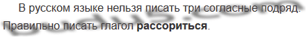 Есть в русском языке глагол ссориться. А если от него образовать другой глагол с приставкой рас-, то... придётся записать утроенную с? Так ли это? Посмотрите в орфографический словарь и сделайте вывод, можно ли в русском языке писать три одинаковые согласные подряд.