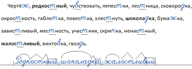 Чертё_, редкос_ный, чу_ствовать, лепес_ки, лес_ница, сковоро_ка, окрес_ность, табле_ка, повес_ка, хлес_нуть, шокола_ка, бума_ка, завис_ливый, мес_ность, учас_ник, скри_ка, ненас_ный, жалос_ливый, винто_ка, гвоз_ь.