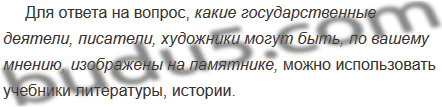 Какие государственные деятели, писатели, художники могут быть, по вашему мнению, изображены на памятнике? Где можно найти информацию для ответа на этот вопрос? Как нужно организовать свою работу?