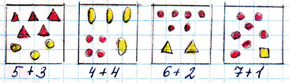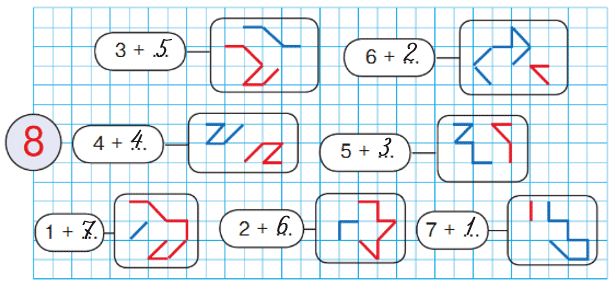 Количество звеньев синей ломаной - первое слагаемое, количество звеньев красной ломаной - второе слагаемое. Сумма всех выражений равна 8.