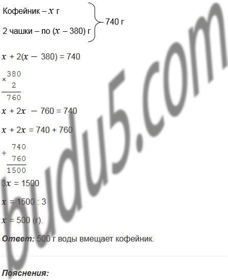 Кофейник и две чашки вмещают 740 г воды. В кофейник входит на 380 г воды больше, чем в чашку. Сколько граммов воды вмещает кофейник?