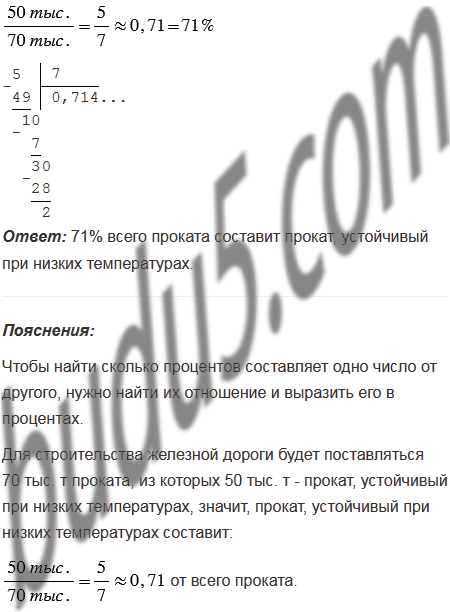 Для строительства железной дороги будет поставляться 70 тыс. т проката, из которых 50 тыс. т - прокат, устойчивый при низких температурах. Какой процент всего проката составит прокат, устойчивый при низких температурах?