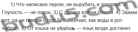 1) Что написано (перьями), не вырубить и (топ..рами). 2) (Глупости) — не (пороки). 3) С (дураков) (взятка) гла(д, т)ки. 4) Зажми (рты), да не г..вори с (годы)! 5) Замолчал, как (вод) в (рты) набрал. 6) От (языков) не уйдёш(?) — (языки) везде достанет.