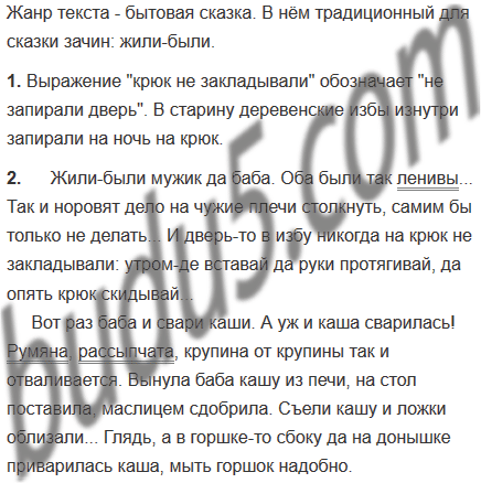 Вот раз баба и свари каши. А уж и каша сварилась! Румяна рассыпчата крупина от крупины так и отваливается. Вынула баба кашу из печи на стол поставила маслицем сдобрила. Съели кашу и ложки облизали... Глядь, а в горшке-то сбоку да на донышке приварилась каша мыть горшок надобно.