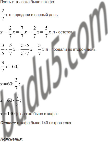 остатка. Сколько литров сока было в кафе, если во второй день продали 60 л?