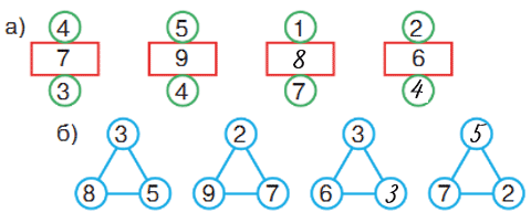а) Сумма верхнего и нижнего числа в зелёных кругах записана в красном прямоугольнике.