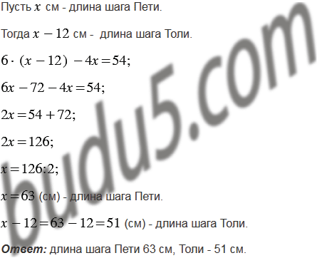 Шаг Пети на 12 см длиннее шага Толи. Но 4 шага Пети короче 6 шагов Толи на 54 см. Найдите длину шага каждого мальчика.
