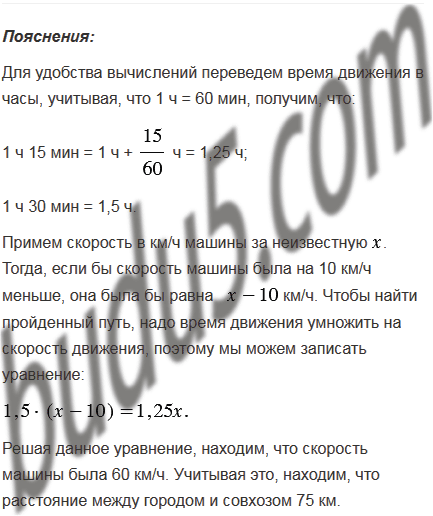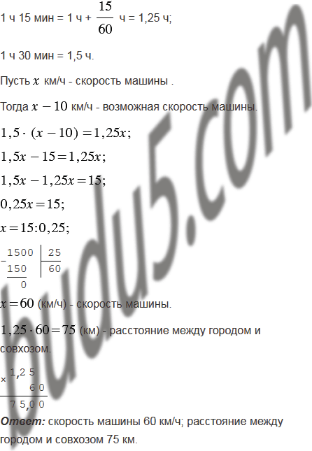 Расстояние между городом и совхозом машина прошла за 1 ч 15 мин. Если бы скорость машины была на 10 км/ч меньше, то этот путь она прошла бы за 1 ч 30 мин. Найдите скорость машины и расстояние от города до совхоза.