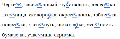Чертё_, завис_ливый, чу_ствовать, лепес_ки, лес_ница, сковоро_ка, окрес_ность, табле_ка, повес_ка, хлес_нуть, шокола_ка, мес_ность, бума_ка, учас_ник, скри_ка.