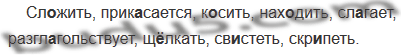 Сло..жить, прик..сается, к..сить, нах..дить, слагает, разглагольствует, щ..лкать, св..стеть, скр..петь.