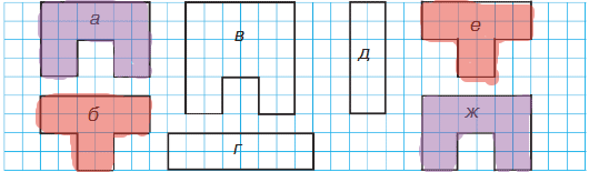 3. Найди равные фигуры и обоснуй свой ответ. Нарисуй фигуры, равные фигурам а и д.