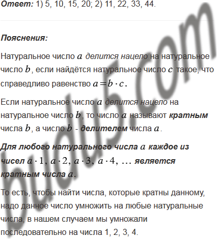 Назовите четыре натуральных числа, кратных числу: 1) 5; 2) 11.