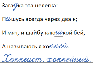 Вставим пропущенные буквы: загадка - загадать (глухая/звонкая согласная), пишусь - пи́сьма (безударная гласная), клюшкой - клюшечка.