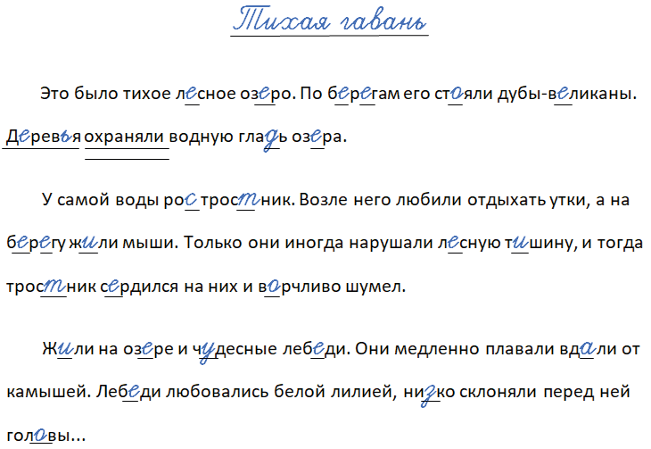 Это было тихое л_сное оз_ро. По б_р_гам его ст_яли дубы-в_ликаны. Д_рев_я охраняли водную гла_ь оз_ра.