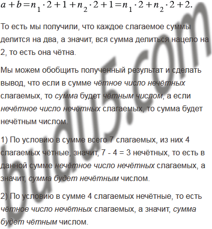 Чётной или нечётной будет сумма семи натуральных слагаемых, если: 1) четыре слагаемых чётные, а остальные - нечётные; 2) четыре слагаемых нечётные, а остальные - чётные?